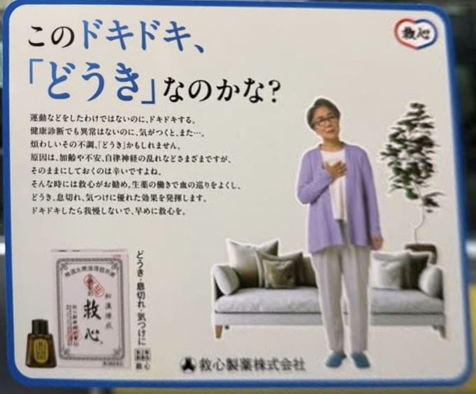 JR列車車廂內某款心臟藥廣告上寫著一句話: