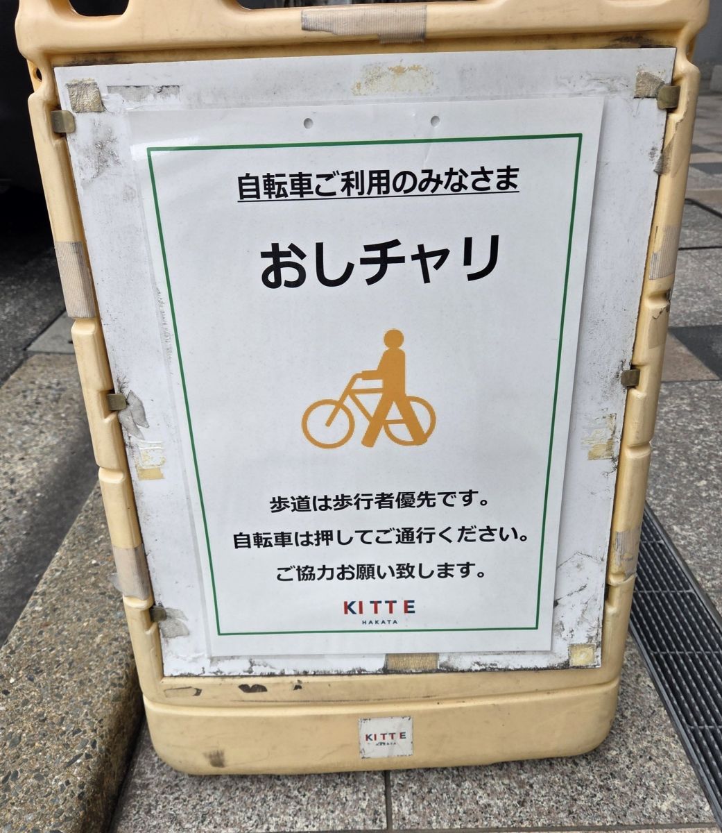 這張告示的重點詞是「おしチャリ(押しチャリ)」,意思是「腳踏車請用牽的」。