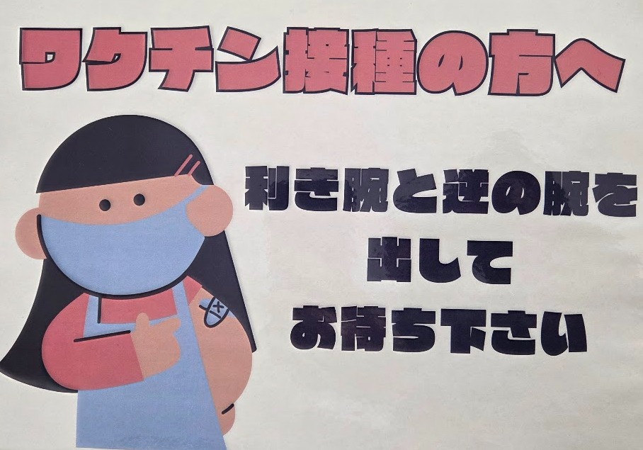 在診所拍到「利き腕と逆の腕を出してください(請伸出非慣用手的手臂)」這樣的說明。