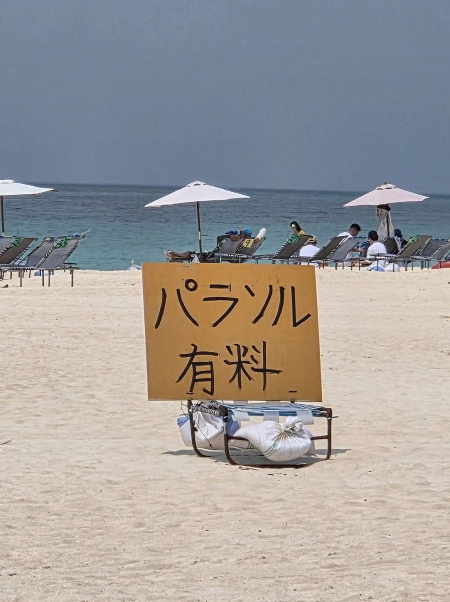 看板上寫著「パラソル有料」。其中「パラソル」是外來語,