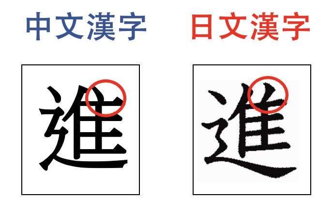 這個「進む」的「進」,那個「隹」字旁在中文裡面是往右撇,