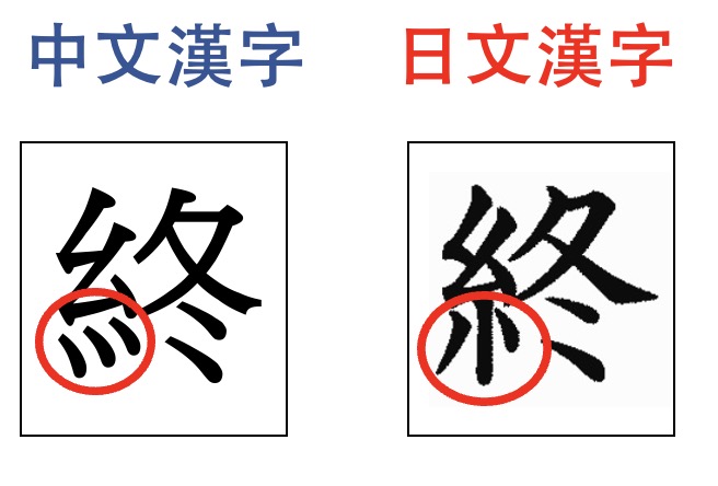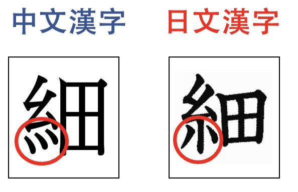 跟中文的差別在於旁邊的「糸」字旁,在中文的糸字旁是三個點