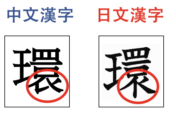「環」最下面那個地方,中文裡會勾起來,但是日文並沒有勾起來