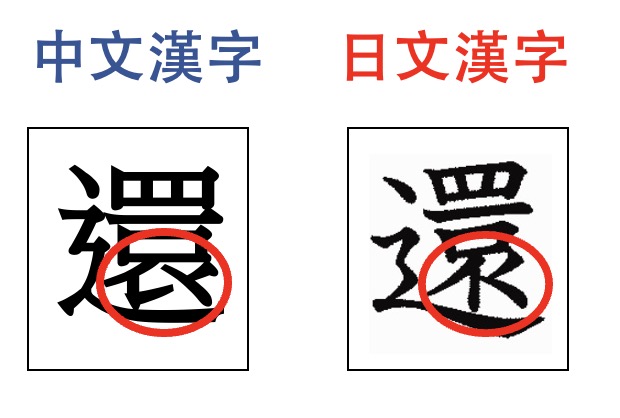還元的「還」跟環境的「環」是一樣的,在中文有勾起來,日文是分開的且沒有勾起來喔!