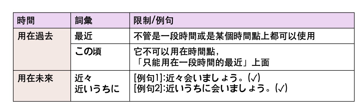 中文裡表達時間上「最近」,日文其實有『最近』『この頃(ごろ)』『近々(ちかぢか)』『近いうちに』這些用法,