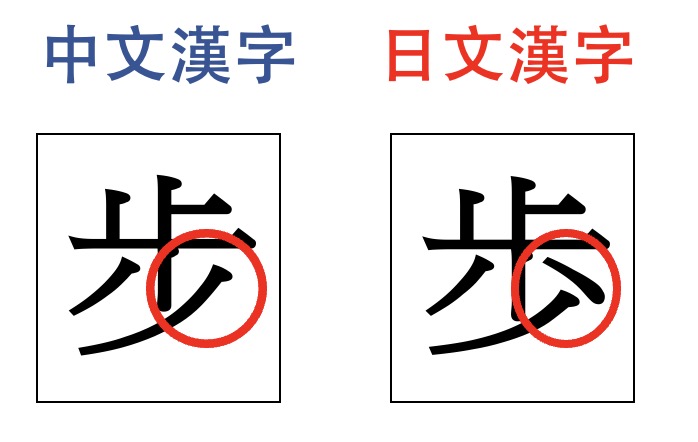 日文「歩」上面右邊有一個點,但是在中文裡沒有那一點
