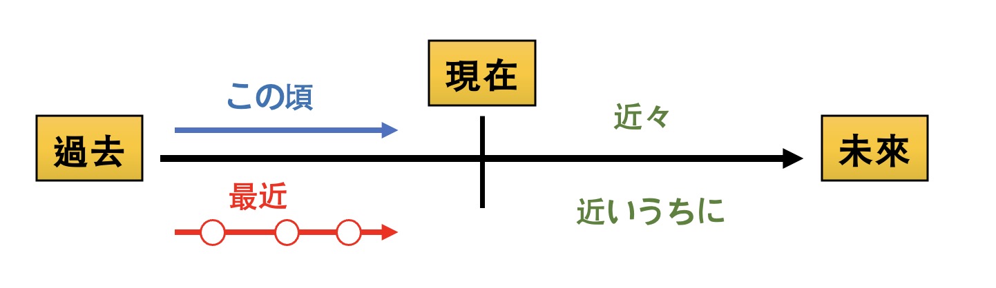 中文裡表達時間上「最近」,日文其實有『最近』『この頃(ごろ)』『近々(ちかぢか)』『近いうちに』這些用法,